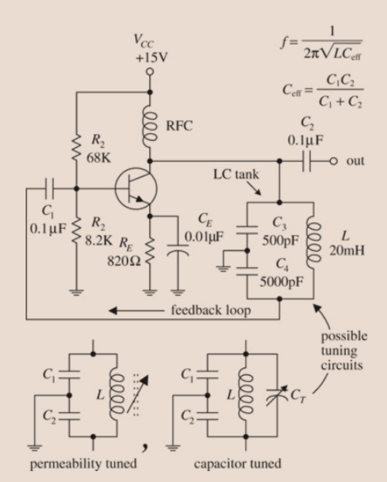 The Colpitts Oscillator comes in multiple different shapes and sizes, but in the example shown above [1], the LC tank circuit uses its resonant frequency to select the frequency of oscillation