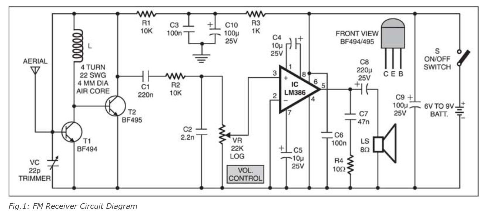 We used this FM radio receiver schematic as inspiration for our circuit design. The Colpitts oscillator is composed of two radio-frequency bipolar-junction transistors, a 4-turn air-core inductor, and a variable 22-pF capacitor. The signal from the antenna is added to the local oscillator’s signal and filtered through a bandpass filter before being sent through a volume control voltage divider and into the LM386 for audio amplification. We use a 22kΩ logarithmic potentiometer for volume control. Bypass capacitors are used throughout the circuit for noise filtration. Moreover, we maximize the LM386 audio gain by placing a 10μF capacitor between pins 1 and 8. We power the circuit with a 9V battery.